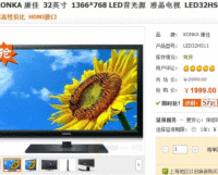 泡泡网液晶电视频道5月16日 ● 产品型号:康佳 LED32HS11 (报价 参数 图片 评论 ) ● 产品现价:1999元 ● 购买链接:新蛋网 ● 编辑点评:在迅速普及的同时,LED背光液晶电视价格也不可避免地一落千丈。当众多品牌32吋LED液晶电视还在死守2x99元价位的时候,康佳率先出手,32吋LED液晶电视LED32HS11只要1999元,和众多品牌32吋CCFL背
