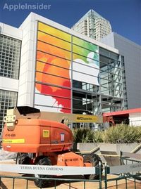 泡泡网资讯频道3月5日 从上周五起,苹果开始装修位于旧金山芳草地艺术中心的总部,这次装修使用了各色横幅装饰着公司富有特色的标志,为本周的新品发布预热。 工人们从早上开始用横幅覆盖外面的玻璃窗,苹果公司用遍及整个公司大楼的巨大装饰来迎接新产品的开幕式。 下午,工人们已经大约完成了对公司大楼窗户一半的装饰工作。今年的装饰背景是由不同的亮丽色彩混合形成,背景之上则是一个巨大的