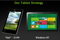 泡泡网平板电脑频道5月24日 NVIDIA公司CEO黄仁勋曾对媒体表示,消费者可能会在今年夏天看到售价199美元的Tegra3平板电脑。而在本周举行的NVIDIA年度投资者会议上,副总裁Rob Csonger公布了公司的199美元Tegra 3平板开发平台Kai。 Rob Csonger表示,Kai并非只是一款硬件设备,而是一个展示四核Tegra 3平板的计划。NVIDIA希