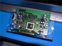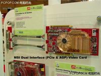 同样是来自微星的消息,在COMPUTEX展会中,微星展示了一款同时支持PCI-E、AGP的显卡,命名为:Dual Interface(暂且称之为:双面人)。 微星Dual Interface的设计非常独特,显卡的接口仍采用AGP 8X设计,但在PCB上方却多处了一个PCI-E X16接口,用户可以根据各自需要选择接口类型。显卡的输出部分也比较特殊,使用两根20~30CM的延长线,但接口仍是保
