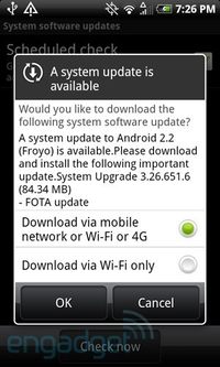 泡泡网手机频道8月3日 之前我们就曾经说过,这款HTC的唯一4G网络支持手机HTC EVO 4G将在年内支持Android 2.2更新,而就在昨天国外已经有人放出手机更新的截图。 从图中,我们就能看出来,HTC EVO 4G已经支持Android 2.2更新了,只是据说该更新内容也就是Androi