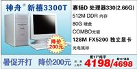自暑促以来,神舟每天都有很多动作,尤其是降价新品不断,让消费者欣喜不已。这次神舟发力台式机,将配有128M FX 5200 独立显卡和COMBO三合一光驱的新禧3300T降价200元,现在配17”纯平也只要4198元,暑促神舟带来更多的实惠。 赛扬D330处理器加COMBO光驱 神舟新禧3300T采用赛扬D处理器330,处理器速度为2.66G,同时配有512M DDR内存,实现
