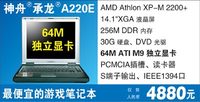 随着高考的结束,暑促也轰轰烈烈的开展起来。对于这每年必争的黄金市场,今年神舟暑促新品的重点放在了针对游戏玩家的带独立显卡笔记本上,推出四款5000元价位的带64M独立显卡笔记本。花5000元,买神舟游戏笔记本,暑假痛快玩游戏,现在购买,还有惊喜好礼送! 64M独立显卡DVD笔记本,4880元起 “承龙”A220E(4880元) 继神舟承龙A240C/A240E一举成名后,