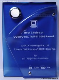在刚结束的台北Computex 2005展会上,全球内存应用产品领导厂商─威刚科技(A-DATA),在经过台湾外贸协会与专家学者之严格评审下,获得评审委员的高度青睐,以卓越的红色威龙系列内存,勇夺COMPUTEX 2005官方最高荣誉奖项「2005最佳外销信息产品奖(Best Choice of COMPUTEX TAIPEI 2005)」(LSI Products、Peripherals