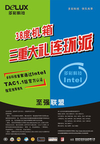 国内最大的电脑外围设备制造商,被业界誉为“中国外设第一品牌”的多彩科技在国内率先推出了专为Intel90纳米处理器设计的38度高级散热机箱。作为Intel中国战略合作伙伴,多彩科技38度高级散热机箱独家率先通过Intel AC 1.1版权威测试认证,并获Intel指定推荐使用! 为答谢全国消费者及多彩科技所有的忠实消费者们,多彩科技与Intel至强联盟,在全国范围内大力推广多彩38