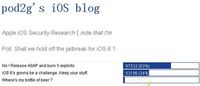 泡泡网手机频道5月3日 消息称,Pod2g在个人博客中放出的是否放出iOS5.1越狱工具的投票,将结束。根据目前的投票结果,赞成在iOS5.1时代就放出越狱工具的用户比例高达63%,远超同意“将越狱漏洞保留至iOS6时代”的34%支持度。 Pod2g 是在上周放出这一投票的,用来收集用户的需求。投票的选项共有三项,一项是“在iOS5时代就放出越狱工具”(No ! Relea