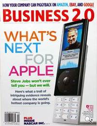 沿著书店内设计的动线走著,美国商业科技杂志 - Business 2.0,在 2005 年 4 月号封面,以全面幅的图片加上醒目的标题,吸引了我的视线,相信这样的封面也可以吸引到书店中其它人的目光,只是大概是放在不明显的地方罢了。Apple 的设计与产品,引领著近几年全世界的 3C 产品,不论是工业设计或是产品特性等,以其极简又富科技感的线条圈住所有目光,这个风暴持续了数年之久,而其下一步