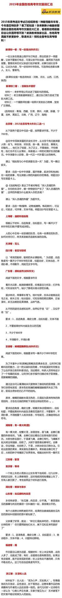 前言:图说每日最鲜科技八卦,笑侃科技领袖逗逼生活。本文收割自新浪微博、微信朋友圈,以及少量的QQ空间。我们对原文不做修改,我们只做发言的搬运工。每周一到周六早晨,我们跪在床前,为您带来每日最鲜科技资讯。——晨博社:要闻————————————————————【1】全国高考作文题目汇总@高考快讯:2015高考语文考试已经结束啦!快来瞅瞅小编最新整理的全国高考作文题目汇总,看看哪些奇葩题目会让你直呼想