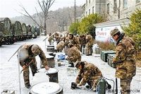 官兵在风雪中展开野炊训练。鲍远新摄 寒风紧,战鼓急,车如龙,虎贲出。近日,山东省威海军分区冬季野营训练在一场带实战背景的应急出动中拉开序幕。 实战化就是要求官兵脑子里有枪炮,心里装着敌情。军分区人员编制少,不可能组建专门的“蓝军”作为砺刀石,如何提升官兵实战意识呢?威海军分区司令员王建政告诉笔者,他们一方面召集了以往参加过上级演习导调的人员成立导调组,参照上级演习的标准和方法,全程、全员、全装