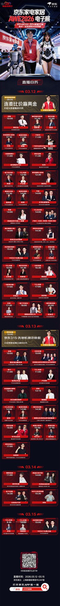 3月12日-15日,2026年中国家电及消费电子博览会(AWE 2026)将在上海盛大开幕。展会期间,京东将围绕家电家居消费场景推出系列直播活动。届时,京东将联动品牌高管、明星艺人及达人嘉宾,打造“总裁+明星”双矩阵直播模式,聚焦新品首发、AI趋势解读、互动福利等内容,带来多场直播,为消费者在AWE期间看新品、选家电、享福利提供更多元的选择。