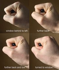 泡泡网数码相机频道1月3日 在摄影中,寻找合适的光线和角度是非常重要的,往往可以直接影响最终的拍摄效果。如何快速简单地找到光线,每个摄影师都有自己的小绝活。photo.net的Steve 21向我们介绍了他最新的心得——用弹珠寻找最佳拍摄光线。 方法很简单,将手握拳,把弹珠压在食指下,通过它,你就能观察到与人眼类似的反光效果。只需要转动手的方向,观察弹珠上光线的变化,你就能找