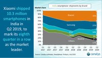 项森 · 2019-08-01 12:46 - 小米引领印度智能手机市场,成为2019年第二季度出货量第一的品牌