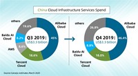 3月23日消息,英国调研公司Canalys在近日发布了最新的中国云计算市场报告。该报告显示,在2019年第四季度中国云计算市场的前3名依次为:阿里云、腾讯云和百度云,而在第三季度还位列第三名的亚马逊云(AWS)则下降至第四名,被归到了others。
