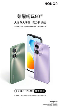 张帆 · 2024-04-12 18:23 - 荣耀畅玩50开启预售:搭配天玑6100+处理器,1199元起