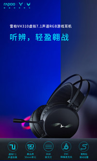 RAPOO雷柏,领军国产外设品牌,实力大厂上市企业为旗下游戏V系列新添虚拟7.1声道RGB的游戏耳机——雷柏VH310,高品质50mm的发声单元,360°高灵敏全指向降噪麦克风,飞翼式的RGB炫彩流光,让你出色辨位,找准敌人方位,给予致命一击。