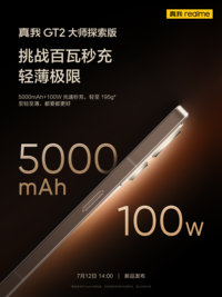 陈沐梁 · 2022-07-08 16:39 - 真我GT2大探搭载100W+5000mAh:手机内置氮化镓,25分钟充满