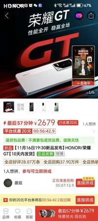 荣耀GT是近期备受关注的一款性能手机,也是荣耀重返互联网市场的先锋产品,从外观设计、性能调校到屏幕护眼都体现出很高的水准。今天,这款新机被曝在拼多多提前上架,价格显示为2699元,优惠20元后价格为2679元。但没有给到具体的内存版本。