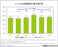 51.com流量价值显著 从2005年51.com创立以来,51.com的注册用户数一直保持高速增长状态,2008年月均新增注册用户数高达400万人,而且呈稳步上升态势。截至2008年底,51.com累计注册用户数已达1.4亿。 同时根据iResearch艾瑞咨询推出的网民连续用户