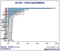 据易观国际(Analysys International)《中国网上零售市场用户调研报告2009》研究发现,用户购买过商品(购买用户渗透率)的购物网站中,淘宝、当当、卓越亚马逊、易趣、拍拍位居前五。其中淘宝的用户的比例最高达89.7%,较去年的81.7%提升了8个百分比。C2C网上零售厂商中,排名与去年相同,易趣在年度购买用户渗透率上仍然领先拍拍网。 用