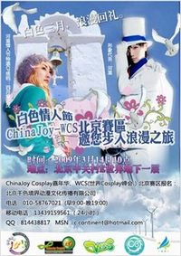 09年3月14日,WCS世界角色扮演峰会(World Cosplay Summit)北京赛区决赛在中关村e世界数码广场负一层拉开战幕。在这一天最终获得评审票数最高的一对选手,将参加最后在上海举办的中国赛区总决赛,也有机会代表中国飞往日本,和日本选手一决高下。 继2008 WCS世界角色扮演峰会(World Cosplay Summit)携手ChinaJoy Cosplay嘉年华比