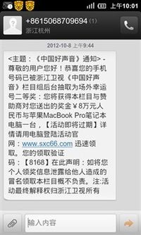 泡泡网安全相关频道10月10日 国庆节后,瑞星客户服务中心接到了大量用户打来的咨询关于“《中国好声音》节目中奖通知短信”真伪的来电,该类短信告知用户手机号被抽取为场外幸运二等奖,可获得高达8至10万元不等的奖金和苹果笔记本电脑一台。“这是典型的钓鱼欺诈”,瑞星安全专家介绍,“瑞星‘云安全’系统在十一长假期间也截获了大量冒充《中国好声音》的诈骗信息。目前,瑞星个人防火墙已能对该类网址进行拦截