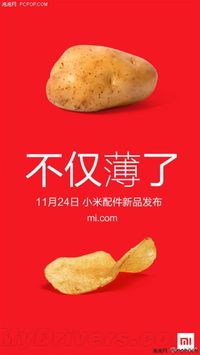 [泡泡网 前沿电子频道] 刚刚,小米手机在官方微博放出预告,称11月24日将发布一款新的小米配件,不仅薄了,而且脆了。宣传海报上是一个土豆和一片薯片,很是形象。只是,这是个啥? 有网友猜测,很可能是之前曝光的那款4G MiFi产品,插入支持4G网络的SIM卡之后就能将网络信号转化为Wi-Fi信号供移动设备使用。之前,型号为NDY-02-AK的小米设备已经出现了工信部,名称为“TD-L