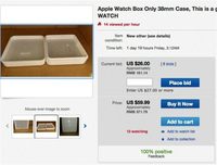 本文转载编译自MacX,原文点击链接 自Apple Watch发布以来关注度一直很高,首批订购的小伙伴也都差不多收到了设备。于是不少Apple Watch用户打起了包装盒的主意,开始在eBay上开始出售Apple Watch的包装盒,其中白色塑料包装盒的目标竞拍价已经高达59.99美元,这让不少人都看傻了眼。不过幸好,理智的人还是很多的,目前参与竞拍的价格还不到10美元。■【那些改变你生活的
