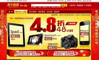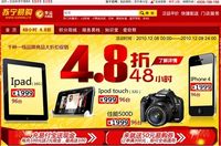12月6日,随着苏宁20周年庆典月的逐步拉开,众多网友的目光投向了上线近一年的苏宁易购,作为苏宁庆典月的一部分,苏宁易购12月8日-12月9日的特价秒杀,将苏宁周年特惠推向第一波的高潮。 从苏宁易购网站看到,其整个网站已经替换喜庆的色调,iphone 4 16G 1999元、ipad 1999元、佳能单反 500D 1999元、ipod touch 999元,四款网络上热销的
